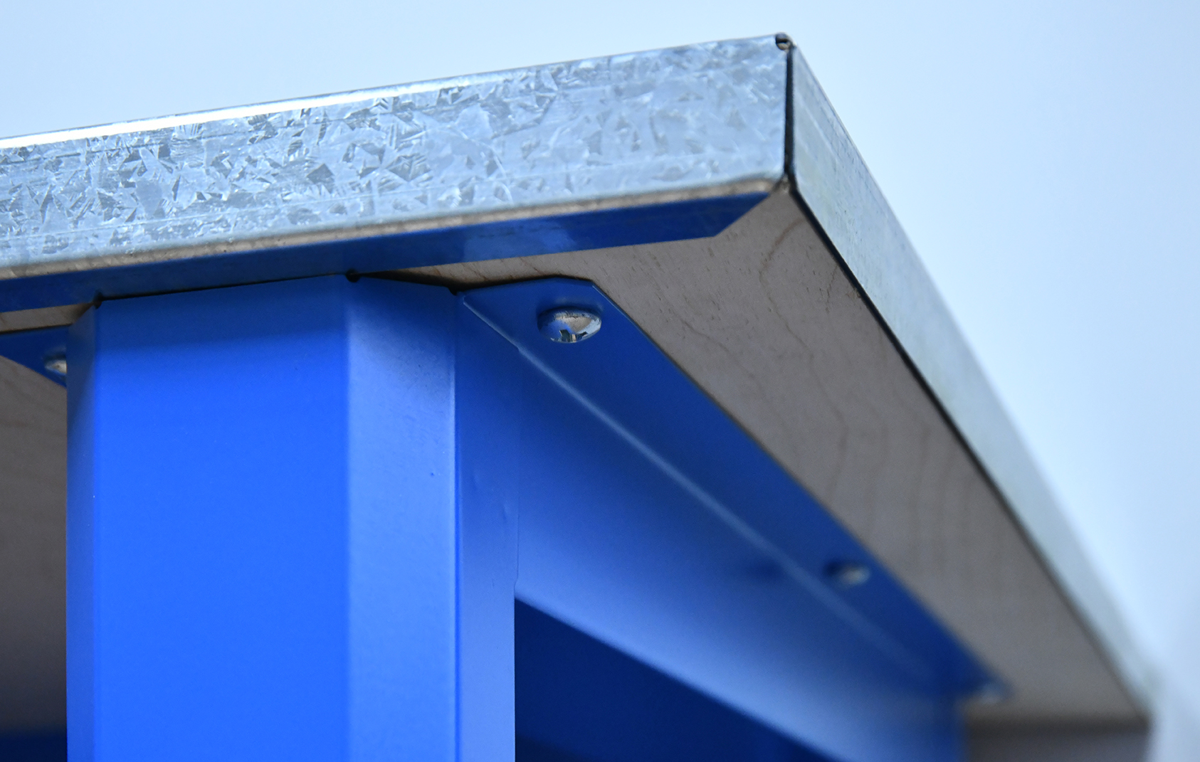 - Столешница изготовлена из влагостойкой фанеры ФСФ толщиной 24 мм, обработанной антисептическим лаком, и усиленной сверху листом холоднокатаной оцинкованной стали толщиной 1.2 мм.