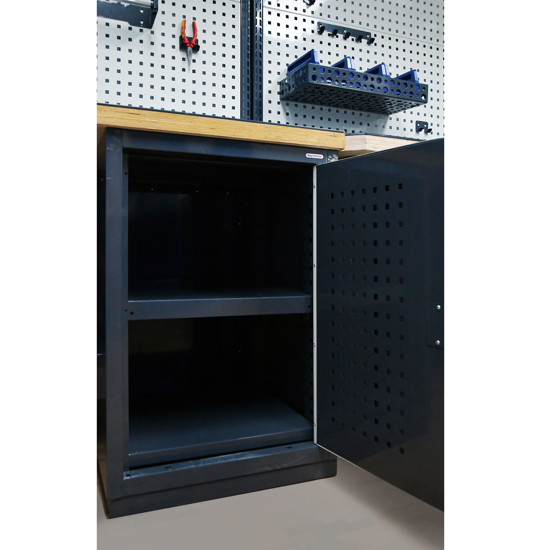 - Жёсткость конструкции усиливается комплектом «полка-стенка», который также создаёт дополнительное место для хранения крупного инструмента, оборудования и контейнеров с мелочами.